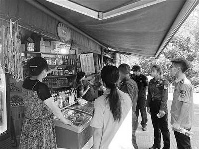 国庆将至,天台县赤城街道综合行政执法队、县消防大队对景区内的商家规范经营、消防安全、垃圾分类等情况进行逐项检查,为游客营造良好的旅游环境。台州政法融媒体中心 张晓琼 通讯员 许安安 摄