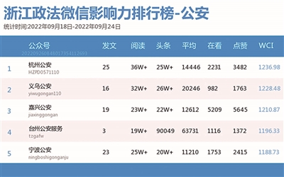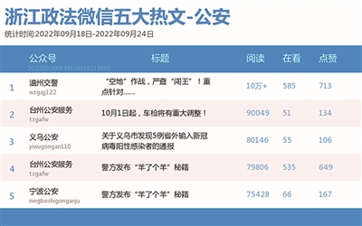 本期公安榜的前三名是“杭州公安”“义乌公安”“嘉兴公安”。而热文榜第一名由“温州交警”的《“空地”作战,严查“闯王”!重点针对……》以“10W+”阅读量拿下。该文曝光了电动车交通违法行为,提醒广大市民安全出行。