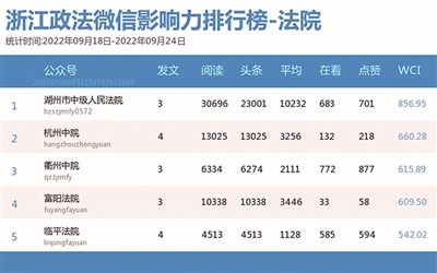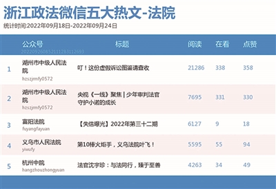 法院榜上,“湖州市中级人民法院”霸榜。该公众号《叮!这份虚假诉讼图鉴请查收》《央视<一线>聚焦 | 少年审判法官守护小诺的成长》两篇文章包揽了热文榜第一、二名。