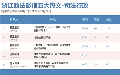 司法行政榜上,“浙江监狱”全面发力,包揽了热文榜前三甲。其中《“美丽情怀”——“警官,能让我抱抱你吗?”》一文讲述了全国司法行政系统先进工作者李永剑在工作中的故事,十分吸睛。