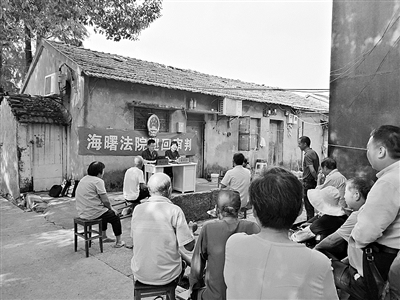 近日,宁波市海曙区人民法院望春法庭法官扛着国徽来到高桥镇望江村巡回审判,化解了一起邻里之间的民间借贷纠纷。众多村民围观了此次巡回审判,法官在庭审后趁机向大家进行了民间借贷普法宣传。
