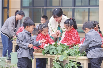 10月8日,德清县下渚湖街道三合幼儿园,老师带领孩子采收毛豆。寒露前后正是毛豆成熟时节,采收下的毛豆经剥壳、水煮、烘制后制成下渚湖特有的烘豆。幼儿园通过开展“制烘豆 学民俗”活动,让孩子们学习农事知识,感受当地民俗。蔡俊 摄