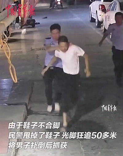 近日,安徽蚌埠,一民警在会议结束返队途中发现一男子疑似案件嫌疑人。在民警将其带往队里核查途中,男子挣脱逃窜,民警立即追赶。由于鞋子不合脚,民警甩掉鞋子光脚狂追50多米将男子扑倒后抓获。