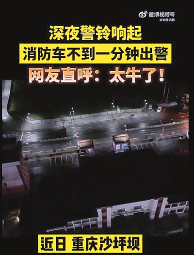 近日,重庆,深夜警铃响起,消防车火速出警。这一幕被消防队楼上的邻居拍下,从警铃响起到出警不到一分钟,网友不禁直呼:太牛了!看得人激动。