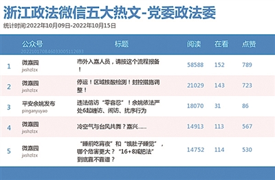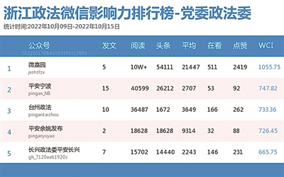 本期政法委榜,“微嘉园”蝉联“双料冠军”。热文榜上,“微嘉园”再次发力,共有4篇推文位列榜单前五。