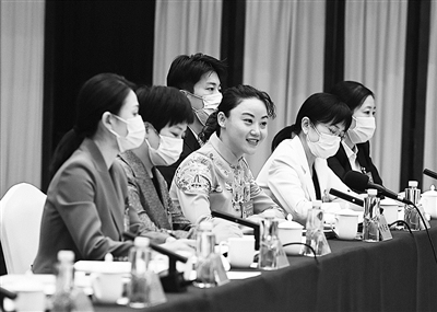 | 10月18日,党的二十大浙江代表团在驻地讨论二十大报告中央纪委报告和党章修正案。 图为女代表风采。《浙江日报》记者 胡元勇 摄 |