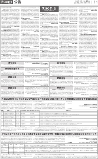 兴业银行股份有限公司杭州分行与中国信达资产管理股份有限公司浙江省分公司债权转让通知暨债务催收联合公告