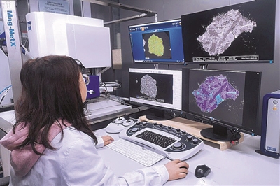 | 中国科学院地质与地球物理研究所扫描电镜与电子探针实验室工程师原江燕在分析嫦娥五号月壤成分(2022年10月14日摄)。新华社发(中国科学院地质与地球物理研究所供图) |