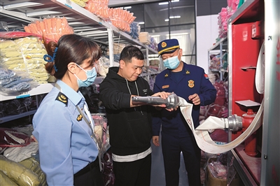 在织里镇东尼路1018号的贝元产业园,检查人员随机走进位于2幢3楼的一家电商企业,这里的员工有的在机器上分装货物,有的推着推车来回穿梭于一排排货架之间。“这个通道要保持畅通,消火栓箱内的设施要会使用。”在一处设置在货架之间的消火栓箱前,检查人员一边要求企业负责人搬掉堆放在通道上的货物,一边指导他如何连接水带和水枪。