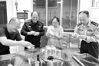 近日,天色已晚,台州市椒江区“阮林根爱心团队”的十余名成员带着饺子皮、饺子馅来到海门派出所,现场包饺子煮饺子,用手工爱心饺慰劳安保一线民辅警。图为警民一起包饺子。