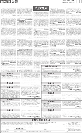 (2022)浙0803民初2793号 胡樟树花:原告郑海燕与被告胡樟树花民间借贷纠纷一案,现已审理终结。因你下落不明,现依法向你公告送达本院(2022)浙0803民初2793号民事判决书。判决如下:一、被告胡樟树花于本判决生效之日起十日内归还原告郑海燕借款本金20000元并支付该借款自2020年9月28日起至2020年11月28日止按全国银行间同业拆借中心公布的贷款市场报价利率的四倍计算的利息;二、被告胡樟树花于本判决生效之日起十日内支付原告郑海燕以借款本金20000元为基数自2020年11月29日起至判决确定履行之日止按全国银行间同业拆借中心公布的贷款市场报价利率的四倍计算的逾期利息损失,被告胡樟树花支付原告郑海燕的逾期利息损失以借款总额30%为限;三、被告胡樟树花于本判决生效之日起十日内赔偿原告郑海燕因诉讼而产生的代理费损失2000元,并由你承担本案诉讼费和公告费。自本公告发出之日起,经过30日,即视为送达。如不服本判决,可在判决书送达之日起十五日内,向本院递交上诉状,并按对方当事人的人数提出副本,上诉于浙江省衢州市中级人民法院。衢州市衢江区人民法院(2022)浙0803民初2311号 陈明辉:原告揭芳云与被告陈明辉民间借贷纠纷一案,现已审理终结。因你下落不明,现依法向你公告送达本院(2022)浙0803民初2311号民事判决书。判决如下一、被告陈明辉于本判决生效之日起十日内返还原告揭芳云借款本金197718.77元并支付自2022年4月10日起至款项还清之日止以借款本金122718.77元为基数按全国银行间同业拆借中心公布的一年期贷款市场报价利率计算的借款利息;二、驳回原告揭芳云的其他诉讼请求,并由你承担本案诉讼费和公告费。自本公告发出之日起,经过30日,即视为送达。如不服本判决,可在判决书送达之日起十五日内,向本院递交上诉状,并按对方当事人的人数提出副本,上诉于浙江省衢州市中级人民法院。衢州市衢江区人民法院(2021)浙10破7号之二 2022年10月11日,本院根据浙江佳鑫机电股份有限公司管理人的申请,依据《中华人民共和国企业破产法》第八十七条第二款、第三款规定,裁定批准重整计划草案并终止浙江佳鑫机电股份有限公司重整程序。台州市中级人民法院(2022)浙1122破8号之二 申请人:浙江天睿工贸有限公司管理人。 2022年10月27日,浙江天睿工贸有限公司管理人向本院提出申请,称浙江天睿工贸有限公司现有财产为银行存款151.37元,无法清偿已产生的破产费用2978.50元,浙江天睿工贸有限公司无其他财产可供分配,请求本院裁定宣告浙江天睿工贸有限公司破产并终结破产清算程序。 本院认为:浙江天睿工贸有限公司的财产不足以清偿破产费用,符合《中华人民共和国企业破产法》关于宣告债务人破产并终结破产程序之规定。依照《中华人民共和国企业破产法》第四十三条、第一百零七条之规定,裁定如下:一、宣告浙江天睿工贸有限公司破产;二、终结浙江天睿工贸有限公司破产程序。本裁定自即日起生效。缙云县人民法院(2022)浙1122破5号之一 因浙江五莲农牧有限公司的破产财产分配方案已执行完毕,依照《中华人民共和国企业破产法》第一百二十条第二款、第三款之规定,本院于2022年10月26日裁定终结浙江五莲农牧有限公司破产程序。缙云县人民法院(2022)浙1122破2号 2022年3月17日,本院根据缙云县中小企业管理咨询有限公司的申请,裁定受理浙江嘉名锁业有限公司破产清算一案。查明,浙江嘉名锁业有限公司经裁定确认的债权总金额为47152703.88元,破产财产仅有28198.59元。浙江嘉名锁业有限公司不能清偿到期债务,并且资产不足以清偿全部债务,事实清楚,且本案不存在破产重整、和解情形。依照《中华人民共和国企业破产法》第二条、第一百零七条之规定,本院于2022年10月24日宣告浙江嘉名锁业有限公司破产。缙云县人民法院(2022)浙1122破2号之一 因浙江嘉名锁业有限公司的破产财产分配方案已执行完毕,依照《中华人民共和国企业破产法》第一百二十条第二款、第三款之规定,本院于2022年10月26日裁定终结浙江嘉名锁业有限公司破产程序。缙云县人民法院(2022)浙1122破5号 2022年4月8日,本院根据缙云县中小企业管理咨询有限公司的申请,裁定受理浙江五莲农牧有限公司破产清算一案。查明,浙江五莲农牧有限公司经裁定确认的债权总金额为42255912.13元,破产财产仅有4587.90元。浙江五莲农牧有限公司不能清偿到期债务,并且资产不足以清偿全部债务,事实清楚,且本案不存在破产重整、和解情形。依照《中华人民共和国企业破产法》第二条、第一百零七条之规定,本院于2022年10月24日宣告浙江五莲农牧有限公司破产。缙云县人民法院