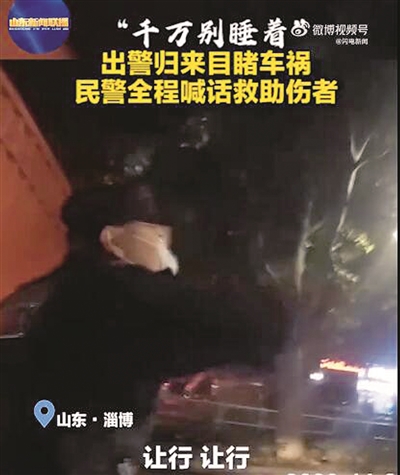 近日,山东淄博民警出警归来,目睹一起车祸,火速投入救援。民警全程喊话救出受伤司机:“没事没事,别紧张。别睡着啊,千万别睡着!”因救助及时,伤者已脱离生命危险。