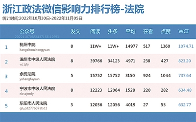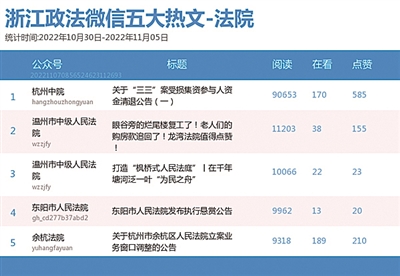 法院榜上,前三名分别为“杭州中院”“温州市中级人民法院”“余杭法院”。热文榜上,“杭州中院”发布的《关于“三三”案受损集资参与人资金清退公告(一)》收获了90653的阅读数。文章针对王文俊、王文澜等人犯集资诈骗罪、伪造国家机关证件罪一案发布资金清退公告,引人关注。