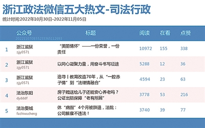 司法行政榜上,“浙江监狱”拿下双榜第一。热文榜上,《“美丽情怀”——一份荣誉,一份责任》一文向我们讲述了省第二女子监狱的民警职工敢于拼搏、奋斗进取的故事,获得10972的阅读数。