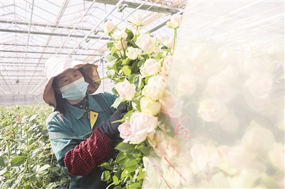 近日,甘肃省兰州新区花卉产业基地智能温室内的鲜切玫瑰竞相争艳,每天近十万枝鲜切花从这里发出。近年来,兰州新区引进先进种植设施设备、种植群体,改良花卉品种选培,玫瑰、蝴蝶兰等高端花卉实现了全季节、全天候生产,年产鲜切花可达1亿枝,不仅畅销国内市场,还远销俄罗斯、哈萨克斯坦等“一带一路”沿线国家。新华社 马希平 摄