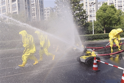 | 身着重型防化服的消防员在消防机器人的掩护下进入现场 |