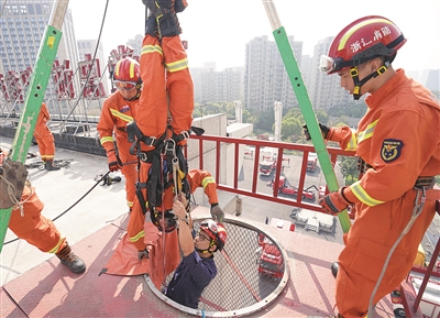 记者和2名消防员被随机安排躲进现场10个铁皮箱中的3个里,然后由训导员带着搜救犬对10个铁皮箱挨个搜寻,很快便将3名“被困人员”找到。在深井救援项目中,“被困”的记者只等了短短几分钟,就被一名倒挂进入深井的消防员救了出去。