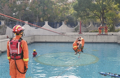 在水域救援方面,消防员演示了绳索横渡、无人机抛投救生圈、水上救生机器人、潜水机器人等项目。只见吊有救生圈的无人机快速到达水中被困人员的上方,然后准确地将救生圈投到“落水者”身边,引得了网友们连连点赞。