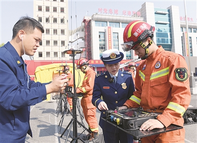 随后,消防员演示了复杂救援场景下的消防机器人组合救援,先通过监控机器人开路,观察救援区域状况,再用喷水机器人排除或减轻火灾和可燃气体等隐患,最后由全副武装的消防员内攻,最终完成救援任务。