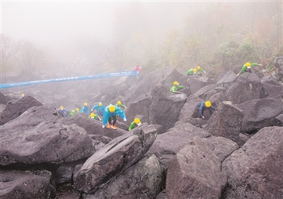 11月13日上午,一年一度的覆卮山攀浪节开启。来自杭州、越城、嵊州、上虞等多支户外运动队伍齐聚绍兴市上虞区岭南乡东澄村,分男女组展开激烈竞逐。大家头戴黄盔,穿着或桔红或绿色运动服,手脚并用,在高低起伏、怪石嶙峋的大石浪上奋力攀爬,体验一场新奇赛事的速度与激情。