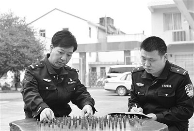 近日,家住三门县沙柳街道石马林村村民林某,主动向沙柳派出所上交123发子弹。原来,林某在清理老屋杂物时,发现阁楼上父亲留下的木箱里有包子弹,因前段时间,他听到派出所民警开展的涉爆涉枪宣传,主动将子弹交到派出所处理。目前,子弹已移交县公安局治安大队处理。图为民警清点登记村民上交的子弹。