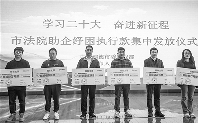 本报讯 近日,建德市法院举行“学习二十大 奋进新征程”助企纾困执行款集中发放仪式,在人大代表、政协委员及媒体记者的共同见证下,现场向6名申请执行人发放执行款2999万元。