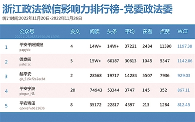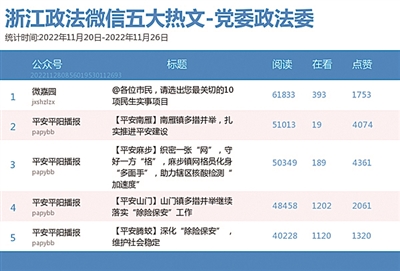 本期政法委榜,黑马“平安平阳播报”夺下榜单第一。热文榜上,“微嘉园”的《@各位市民,请选出您最关切的10项民生实事项目》一文获得广泛关注。