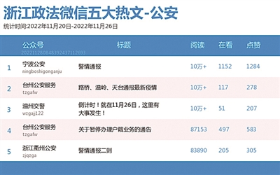 本期公安榜前三依次为“宁波公安”“杭州公安”“义乌公安”。热文榜上,“宁波公安”《警情通报》对当地近期违反疫情防控规定的情况进行了通报。