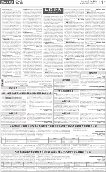 (2022)浙0726民初3357号 张高:本院受理原告柳常常诉被告张高民间借贷纠纷一案,已审理终结。现依法向你公告送达(2022)浙0726民初3357号民事判决书。本院判决如下:由被告张高归还原告柳常常借款15000元,并支付利息(以15000元为基数,自2022年9月15日起按同期全国银行间同业拆借中心公布的一年期贷款市场报价利率计算至实际履行之日止),限于本判决生效后十日内付清。如不服本判决,可以在判决书送达之日起十五日内,向本院递交上诉状,并按对方当事人的人数提出副本,上诉于浙江省金华市中级人民法院;也可以在判决书送达之日起十五日内,向浙江省金华市中级人民法院在线提交上诉状。自本公告发出之日起,经过三十日即视为送达。浦江县人民法院(2022)浙0802民初7024号 衢州市俊霞商贸有限公司:本院受理原告淄博市临淄方兴化工有限公司与你买卖合同纠纷一案,因你下落不明,现依法向你公告送达案件的起诉状副本(诉讼请求:依法判令被告偿还原告货款937000元及利息损失)、应诉/举证通知书、外网查询告知书、风险提示书、廉政监督卡、独任审理通知书、令状式裁判文书告知书及开庭传票。自本公告发出之日起经过30日即视为送达。提出答辩状的期限和举证期限分别为公告送达期满后的15日内和30日内。本案定于举证期满后的第三日(节假日顺延)上午9时在第十五法庭开庭审理。逾期将依法缺席判决。衢州市柯城区人民法院(2022)浙1004民初6716号 孙平静:本院受理(2022)浙1004民初6716号原告郑雪燕与你为民间借贷纠纷一案,因你外出,下落不明,依照《中华人民共和国民事诉讼法》第九十五条之规定,向你公告送达起诉状副本、应诉材料、开庭传票及举证通知书(举证期限截至2023年2月5日)。原告起诉要求:1.判令你偿还借款人民币50000元,并支付自2022年4月25日起至实际履行完毕之日止按月利率1%计算的利息;2.本案诉讼费用由你承担。自本公告发出之日起,经过三十日,即视为送达。提出答辩状的期限为公告送达期满后的十五日内,并定于2023年2月6日9时55分在本院第九审判庭公开开庭进行审理,逾期将依法缺席判决。台州市路桥区人民法院