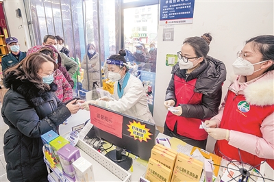 12月19日,长兴县太湖街道爱心医药龙溪御庭店,店员和志愿者为市民免费赠送退烧药品布洛芬。连日来,太湖街道乡贤朱美平将通过各种渠道购得的300瓶布洛芬片,通过10家药店免费发放给有需要的市民,赢得群众点赞。吴拯 摄