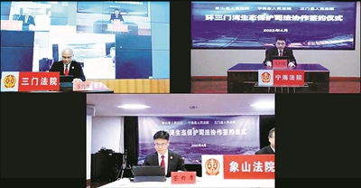 2022年4月,宁波象山、宁海和台州三门三家法院签署环三门湾生态保护司法协作机制实施意见,在类案统一裁判、资源联通共享、生态联防共治等方面建立常态化协作机制,实现跨地区、跨区域环境保护联防共治。同年6月,宁波海曙、江北、镇海、奉化等八家基层法院联合签订框架协议,共同建立三江流域生态保护司法协作机制。