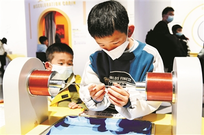 近日,家长带着孩子在金华市的科技馆里体验科普装置,一边学知识一边过新年。