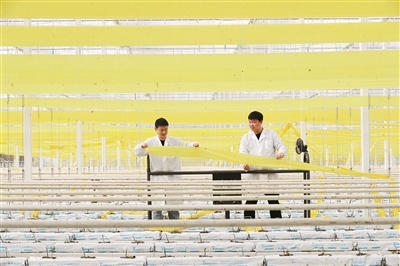 1月28日,工人在湖州市德清县阜溪街道龙胜村的水木蔬菜工厂番茄种植智能大棚内悬挂物理防虫带。