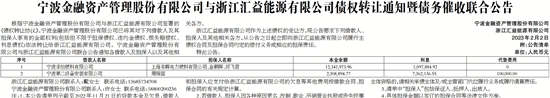 根据宁波金融资产管理股份有限公司与浙江汇益能源有限公司签署的《债权转让协议》,宁波金融资产管理股份有限公司已将其对下列借款人及其担保人享有的全部权利(包括但不限于担保债权、违约金债权、损失赔偿权、利息债权)依法转让给浙江汇益能源有限公司。宁波金融资产管理股份有限公司与浙江汇益能源有限公司联合公告通知各借款人及担保人以及其他相关各方。