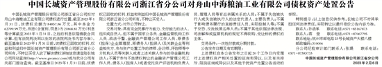 中国长城资产管理股份有限公司浙江省分公司对舟山中海粮油工业有限公司债权资产处置公告