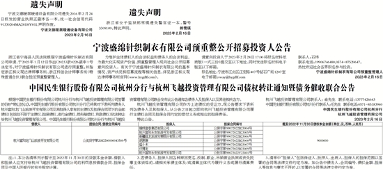 中国民生银行股份有限公司杭州分行与杭州飞越投资管理有限公司债权转让通知暨债务催收联合公告