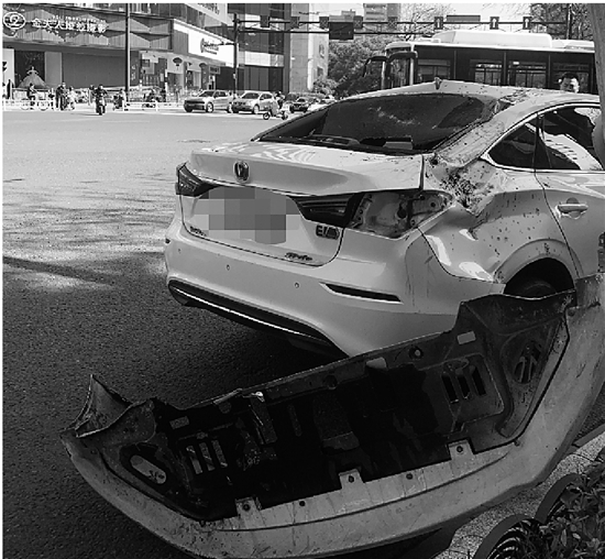 在中河北路和体育场路交叉口处,记者看到了被砸中的白色长安汽车,车辆车头、车身右后方及后挡风玻璃有多处受损,前挡板已经脱落。据了解,该车为绿牌网约车,司机说,当时他正驾驶车辆沿着体育场路由东向西行驶,在经过体育场路武林广场南公交车站时被树杈砸中,所幸当时车上没有乘客,司机也未受伤。