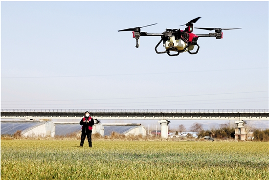 2月19日,在山东省枣庄市光明路街道丁庄村麦田里,农业技术员操作植保无人机给小麦喷施叶面肥。