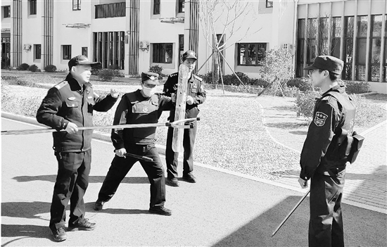 连日来,台州市公安局椒江区分局章安派出所一边积极排查校园安全隐患,一边主动加强对学校保安应急处置能力的培训。图为民警在教授幼儿园保安如何使用防范装备。