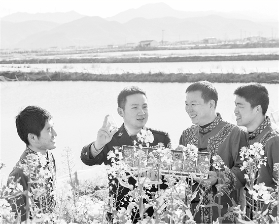 三门县公安局海润派出所抓住春季铲毒有利时机,组织民警深入田间地头和养殖塘开展踏查铲毒工作。图为2月27日,民警在涛头村养殖塘向畲族群众宣传毒品危害。 通讯员 林利军 摄
