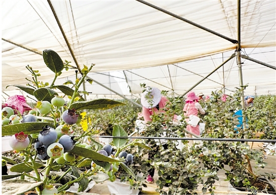| ▲云南蓝莓今年大丰产,当地新农人准备开拓新的销售渠道,借助拼多多等电商平台把高品质的蓝莓卖好。图为云南建水的果农在大棚里采摘蓝莓。 朱博|图 |
