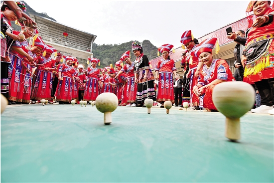| 3月5日,在广西大化瑶族自治县大化镇仁良村,妇女参加陀螺比赛。 当日,仁良村举办“三八”国际妇女节陀螺比赛,壮、瑶、汉等各族妇女欢聚一堂,通过打陀螺、跳竹竿舞、品长桌宴等丰富多彩的民俗体育和文化活动,迎接节日。 新华社记者 黄孝邦 摄 |