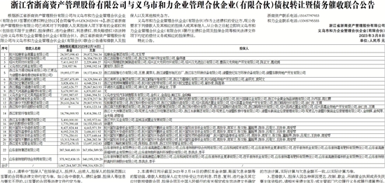 根据浙江省浙商资产管理股份有限公司与义乌市和力企业管理合伙企业(有限合伙)签署的《债权转让协议》【合同编号:01ZX2022031-6】,浙江省浙商资产管理股份有限公司已将其对下列借款人及其担保人项下享有的全部权利(包括但不限于主债权、担保债权、违约金债权、利息债权、损失赔偿权)依法转让给义乌市和力企业管理合伙企业(有限合伙)。浙江省浙商资产管理股份有限公司与义乌市和力企业管理合伙企业(有限合伙)联合公告通知借款人及担保人以及其他相关各方。