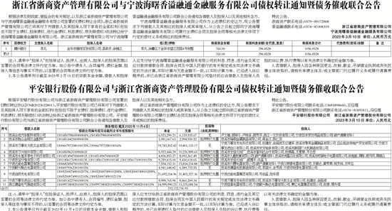 浙江省浙商资产管理有限公司与宁波海曙香溢融通金融服务有限公司债权转让通知暨债务催收联合公告