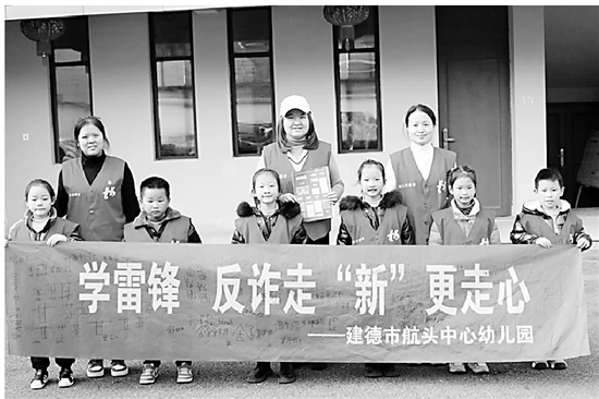 近日,建德市航头镇联合当地司法所、寿昌派出所,在航头中心幼儿园举办“学雷锋 反诈走‘新’更走心”主题签名活动,为孩子们讲解生活中的常见诈骗伎俩,提高孩子们的反诈防骗意识和能力。