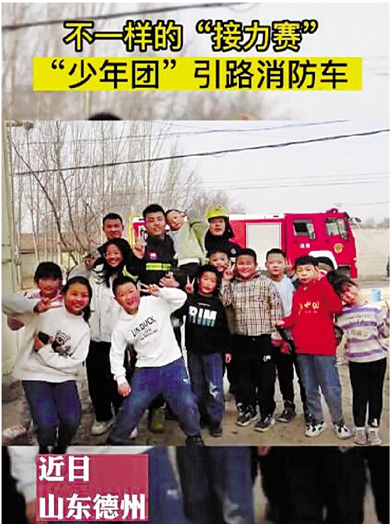 近日,山东德州,村中路边杂草起火。消防员赶赴,老远就看到有骑车萌娃在村口等待。接到消防车后,一名小姑娘招手引路,车辆行至不远,又接连遇到好几拨接应带路的小朋友。可爱少年团的接力引路,为消防灭火争取了宝贵的时间。