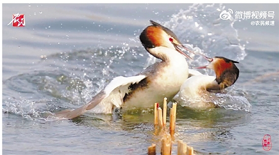 阳春三月,两只雄性凤头鸊鷉(pìtī)为了得到心仪的媳妇,上演了一出夺偶大戏。从剑拔弩张,到龙争虎斗,双方打得异常激烈,斗得精彩纷呈。网友:明明是武打片,我怎么觉得像喜剧片?