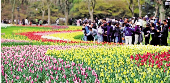 3月12日,杭州西湖景区太子湾公园陆续绽放的郁金香、樱花、玉兰花等组成一幅春日画卷,市民、游客徜徉其中,享受花海浪漫。