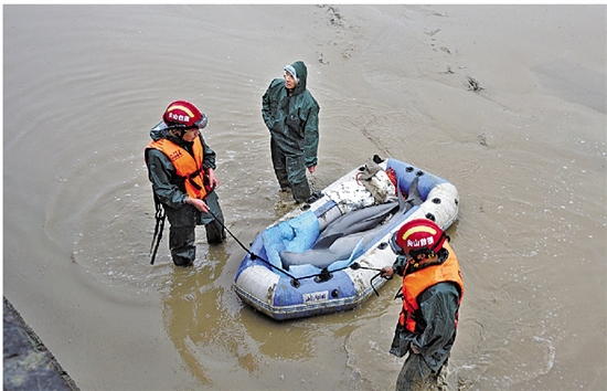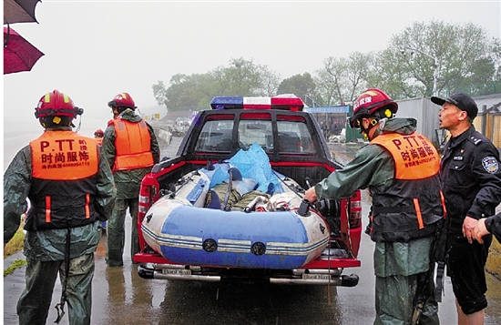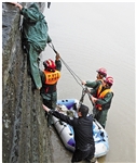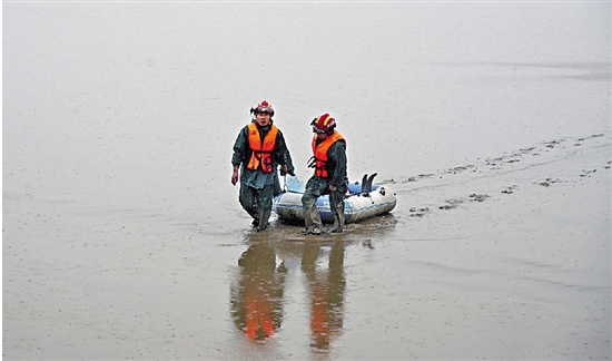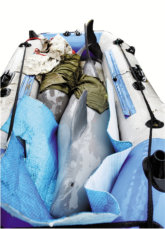 随后,救援人员拖着皮划艇,小心翼翼来到江豚身边,合力将它们逐一抱上皮划艇,盖上湿布并不停往它们身上淋水,避免皮肤干燥脱水,然后迅速从浅水区转移至岸边。接着,救援人员利用抢险救援车吊臂将皮划艇吊上岸,再驱车追潮。