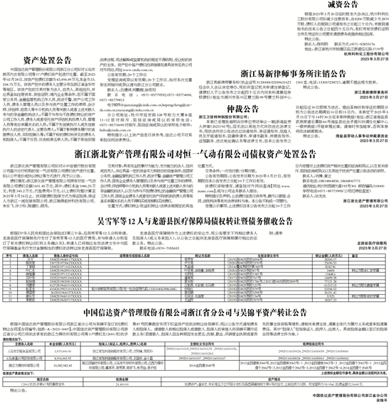 浙江浙北资产管理有限公司拟对从中信银行股份有限公司温州分行收购的恒一气动有限公司债权资产进行处置,拟以公开竞价或协议转让等方式进行,现予以公告。